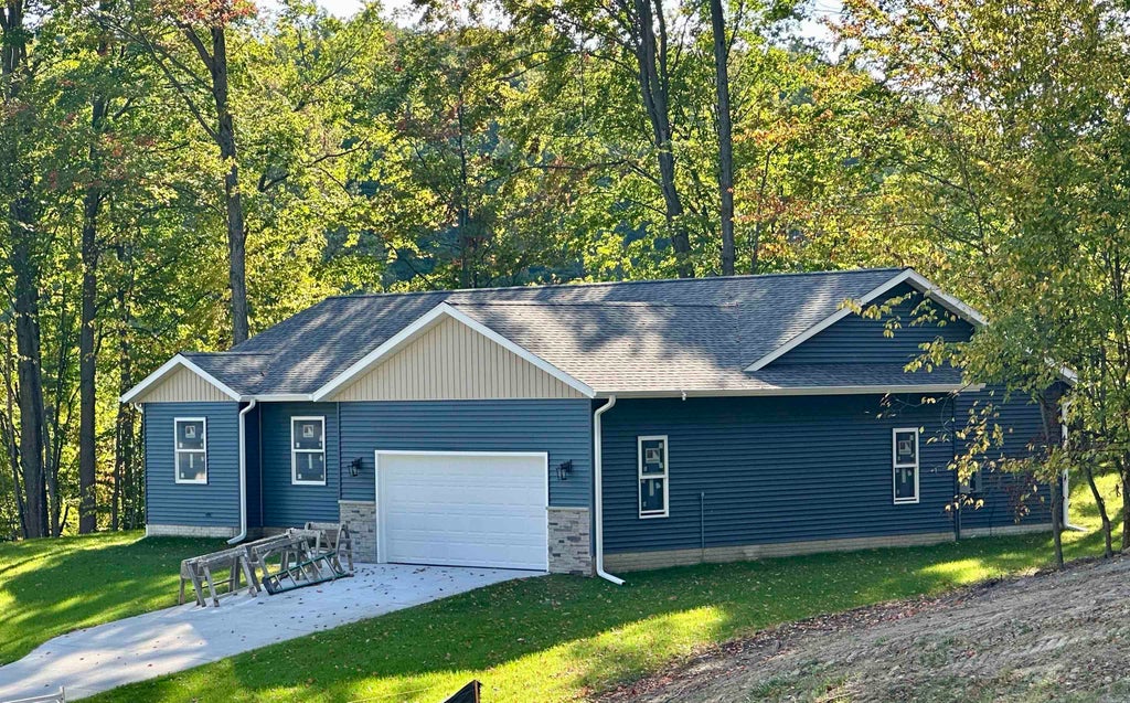 Spectacular Ranch in a new upscale development named Birmley Hills site condominiums. Easy exterior maintenance: Midnight Surf (Grayish Blue)vinyl siding with stone accents. You will love the Andersen windows. This is an open floorplan with vaulted ceilings, a ton of upgrades including spacious living room, dining room with slider to maintenance free deck, Private primary suite has walk-in closet with stylish built-ins and GORGEOUS custom tiled shower with dual shower heads, Lots of natural light, Luxury vinyl flooring throughout , large kitchen peninsula with high grade granite, Modern White soft-close Shaker cabinets with handles , tile backsplash, built-in pot filler, dishwasher, microwave, and garbage disposal included. Main floor laundry with cabinetry above, full basement with egress window, attached oversized, insulated and drywalled 24 x 33 garage which is at least a 2.5 car garage featuring the perfect workshop/storage space, high efficiency natural gas furnace, city water and sewer, central air, composite covered front porch and back deck, gutters, concrete driveway, irrigated & hydroseeded yard. You may fence from the back of the home. October completion. Write an offer now and have 7 days to inspect when completed!