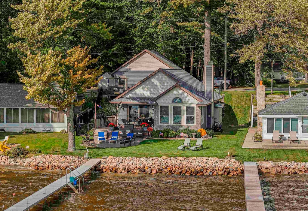 Welcome to the Lakefront Lifestyle This beautifully maintained 3-bedroom, 2-bath home invites you to enjoy the very best of lakefront living. Thoughtful updates include a new roof (2024), fresh siding, a newly stained deck, patio, rock retaining wall, built up the yard to level it (2023), lakeside windows (2019) and more. Move in with confidence knowing the big projects are already done. The home is also wired for a generator. The sandy-bottom shoreline is ideal for swimming, while the included 13-section dock with stairs offers plenty of room for boats and water toys. Spend your days on the lake and your evenings watching the sunset across the water from the back deck, dock or while gathered around the bonfire. Inside, an open-concept floor plan with vaulted ceilings creates a bright, welcoming atmosphere, while the stone fireplace brings warmth and character to the heart of the home. The spacious laundry room makes lakeside living easy, with extra cabinetry that doubles as walk-in pantry space. The primary en-suite has french doors, a private bathroom and walk-in closet. An oversized 2-car garage provides even more storage, complete with an upstairs loft perfect for stowing lake gear. A small fenced area adds convenience for kids or pets, giving you peace of mind while you relax. Let's talk about location. Only a 5 mile drive to all the north end of Cadillac has to offer. Grocery shopping, Starbucks, TJMaxx, restaurants and more! Whether you're looking for a year-round residence or a vacation get-away, lakefront homes like this dont come around often-dont miss your chance to make it yours! **furnishings/decor are available for purchase as well which would make this easy to move right into!**