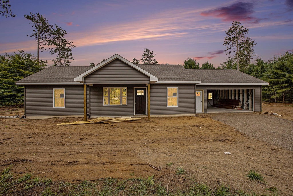 Under Construction Ranch at 3494 Gleaner Hall Rd, Kingsley, MI 49649 Discover a brand-new, 1,171 sq ft ranch-style home on a 2.5-acre lot in serene Kingsley, just south of Traverse City. Estimated completion is Nov 15, 2025. This 3-bed, 2-bath home features a 444 sq ft unfinished garage, built on a slab with durable concrete Superior Walls, vinyl siding, asphalt shingles, and vinyl windows. Energy-efficient with R-37 wall and R-50 ceiling insulation, it has a furnace with central A/C, on-demand water heater, well, septic, and electric/propane utilities (propane will be buyer-established). The layout offers a 222 sq ft living room, 146 sq ft kitchen with white cabinetry and laminate counters, 131 sq ft primary bedroom with 72 sq ft bath and 15 sq ft closet, plus two bedrooms (166 & 145 sq ft). Features carpet in bedrooms, luxury vinyl plank flooring elsewhere, and LED lights. No appliances included, but prepped for electric stove and fridge with water/ice hookup. Enjoy a 5x10 concrete front porch and a 10x20 concrete back patio, Construction is at rough-in framing, with siding due early Sept 2025. Customizations are possible before material orders (cabinets by 9/19/25), with minor cost increases. Earnest money buyers get walkthroughs and punch lists; otherwise, sold as-is with a 1-year warranty. Photos of similar spec homes showcase the builders quality. Come and see this durable, efficient home!