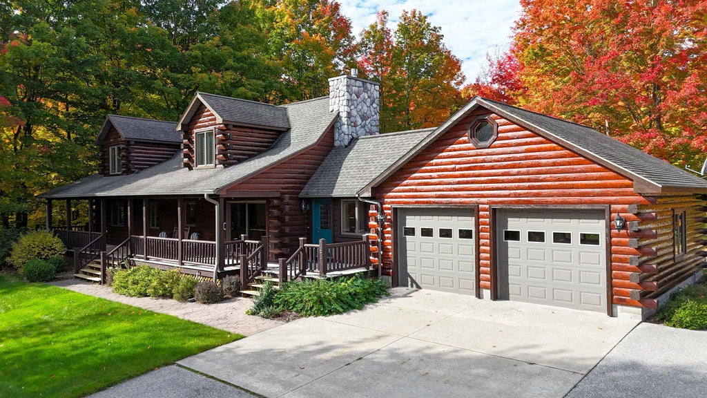Set on 10.3 peaceful acres in Acme, this 3-bedroom, 2.5-bath log home offers privacy, space, and the natural beauty of Northern Michigan-just 15 minutes from both Traverse City and Elk Rapids. Additionally, a four minute drive down Brackett Road takes you directly to the Traverse City Horse Show! A quiet road leads past cherry orchards and horse farms before curving into a wooded canopy forest. A winding blacktop driveway takes you up to a beautiful hilltop clearing, where the 3,000 sq ft home sits surrounded by nature. Inside, youll find tongue and groove ceilings, a large stone gas fireplace, hickory cupboards, and warm wood finishes throughout. The living spaces are open and welcoming. The main floor living layout makes this home exceptionally accessible and easy to live in. The basement includes a finished room with an egress window and closet, making it a conforming fourth bedroom. The 2-car garage is plumbed and wired, offering easy potential for extra finished space. For RV enthusiasts, a utility run under the driveway leads to three RV hookups with septic, two 50-amp, and one 30-amp circuits. This is a peaceful, wildlife-filled setting-deer, birds, rabbits-perfect for anyone looking for space, quiet, and convenience in the heart of Northern Michigan.