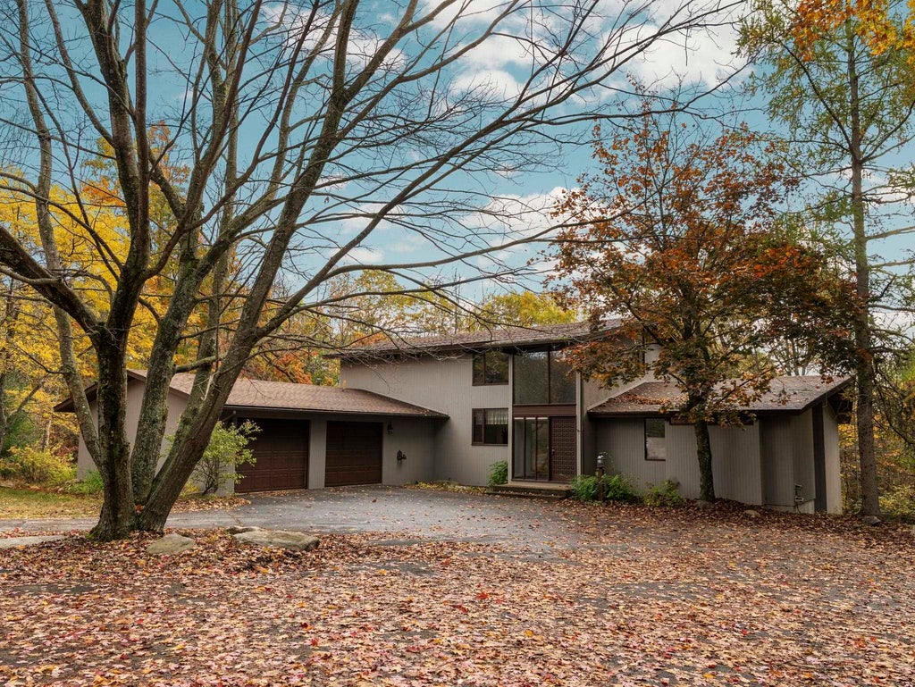 This distinctive 3-bedroom, 2.5-bath Deck House-style residence offers timeless architectural character and over 4,100 square feet of finished living space on a beautifully wooded 4.66-acre parcel. Designed with signature post-and-beam construction, cedar siding, and expansive windows, the home blends natural materials with open, light-filled spaces. The main level features a spacious primary suite and an inviting living area with soaring ceilings, a fireplace, and access to a serene sunroom overlooking the property. A separate formal dining room provides an elegant setting for gatherings, while the kitchen offers abundant workspace, a large granite island, and a casual dining area-perfect for entertaining. A large laundry/mudroom just off the garage entry adds everyday convenience. Upstairs, youll find two additional bedrooms and a private home office/study-ideal for remote work or creative pursuits. The fully finished walkout lower level provides generous space for recreation, guests, or hobbies, complementing the homes thoughtful layout. Recent 2023/2024 updates include a new boiler, water heater, exterior paint, and septic service. While the home would benefit from some cosmetic updates, it offers incredible potential for someone to make it a true showpiece once again. Immediate possession available. An oversized attached two-car garage and a convenient location just minutes from town, M-115, and US-131 make this property the perfect blend of privacy and accessibility. Experience the craftsmanship, warmth, and natural beauty that define the classic Deck House design.