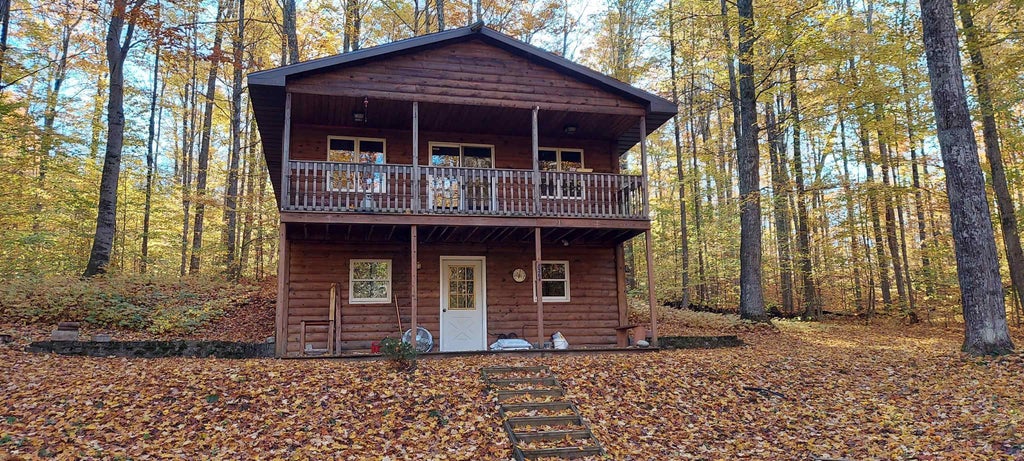 2 bedroom 2 bath log sided home nestled on 10 beautiful acres of hardwoods in northern Michigan. Hardwood floors and vaulted ceilings give it the cabin feel. The covered deck allows you the opportunity to enjoy the sounds and wildlife. The detached garage is insulated and finished. Conveniently located close to shanty creek resort and all the lakes in the area. New well in 25 and the roof was replaced in 21.