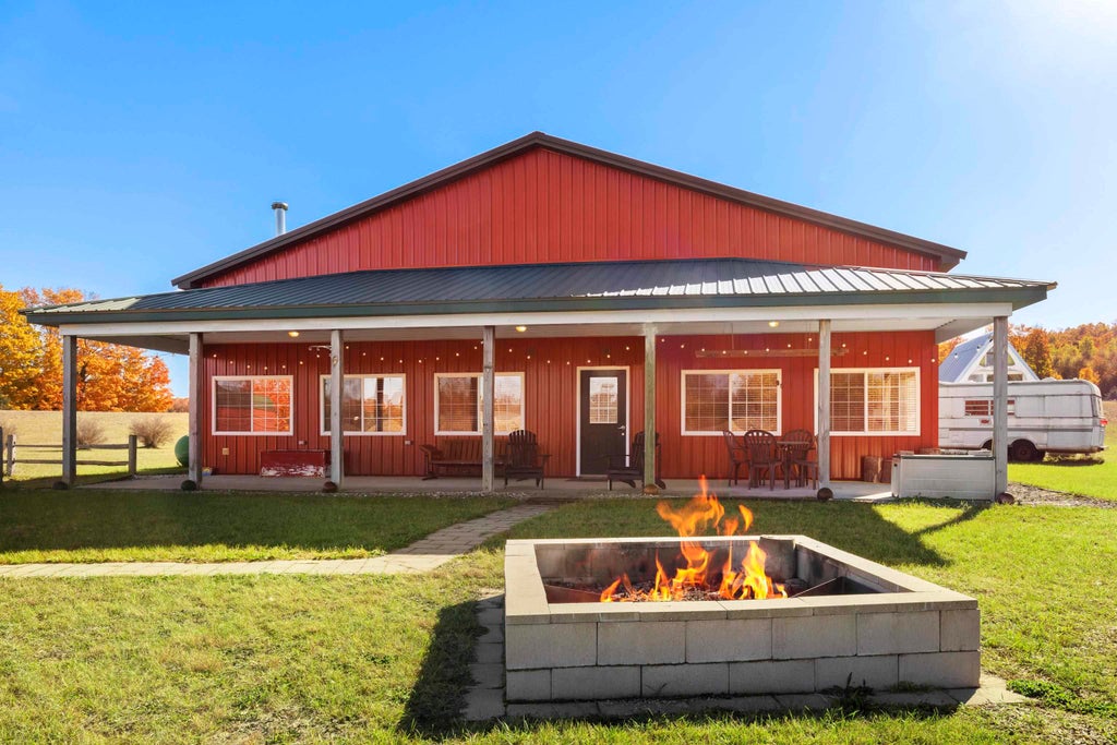 Discover a one-of-a-kind country retreat on 10 open acres-fully fenced and ideal for a hobby farm, gardening, or simply enjoying wide-open space and fresh air. The impressive 48 x 76 pole building combines over 1,200+ sf of thoughtfully designed living space with a large workshop area and features soaring ceilings, 12 and 8 overhead doors, a workshop with an additional 8 overhead door, plus stairs leading to a 500 sf loft for storage or potential future expansion. Inside, creative craftsmanship defines every corner: hand-laid art tile on the kitchen counters and bathroom floors, a repurposed factory table with swing-out seating, and corrugated steel accents on the ceilings, backsplash, and kitchen island. A nature totem greets guests in the entryway, reflecting the artistic personality of this distinctive home. The open main level offers two bedrooms and two baths, with a non-conforming loft bedroom accessed by a stair ladder, plus central air in the living area for comfort. The grounds include additional 21 x 38 and 20 x 20 storage buildings. A charming creative studio cabin with attached greenhouse adds even more character-a cozy spot for art, reflection, or garden starts. A vintage travel trailer project can remain or be removed at buyers preference. Sold furnished, this property also includes yard tractors and implements-ready for immediate enjoyment or light agricultural pursuits. Located in a peaceful rural setting yet within easy reach of town conveniences, this property offers the perfect blend of creativity, practicality, and open-air freedom.
