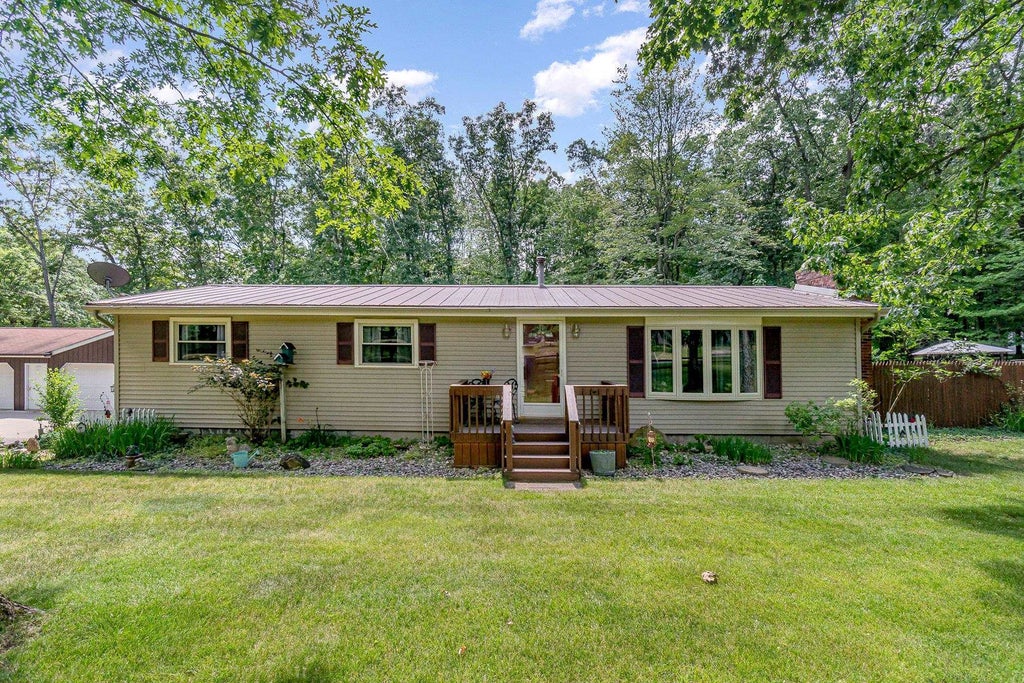 Welcome to this beautifully maintained 2-bedroom, 2 bath ranch nestled on 1.52 peaceful acres with access to Whitebirch Lake. Offering approximately 1,281 square feet of comfortable main floor living, this home features a warm and inviting living room with a fireplace, a convenient half bath located in the primary bedroom, and a full finished basement with a second fireplace: perfect for additional living or entertaining space. Outside, you'll find a paved driveway leading to a spacious 5-stall garage that has concrete flooring, and electrical and is ideal for vehicles, storage, or workshop needs. The property is part of a well-appointed community offering a wide range of amenities, including a clubhouse, swimming pool, tennis and basketball courts, and even a 9-hole golf course. Whether you're looking for a peaceful year-round residence or a relaxing weekend retreat, this property combines comfort, recreation and natural beauty in one inviting package.