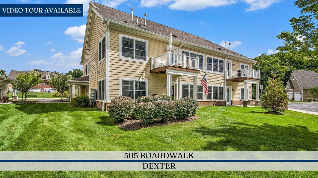 Over 2300 square feet of quality luxury living space in the heart of Dexter at Grandview Commons in a first-floor ranch condo with finished lower level, all just footsteps to the southern entrance of the Border to Border Trail. Short walk to downtown restaurants, parks, and shopping. Beautifully executed layout with quality interior finishes, including white kitchen cabinetry, designer tile backsplash, granite countertops, large island with snack bar, stainless steel appliances, and LVP floors for the max in durability and beauty. Cozy fireplace in the living room and spacious primary suite with a large walk-in & beautifully appointed quartz bath. An additional bedroom served by the main bath, along with first-floor laundry. Well-lit lower level features egress in the large bedroom and oversized family room with a full bath. Great for families or visiting friends. Andersen windows throughout. Be sure to watch the video tour!